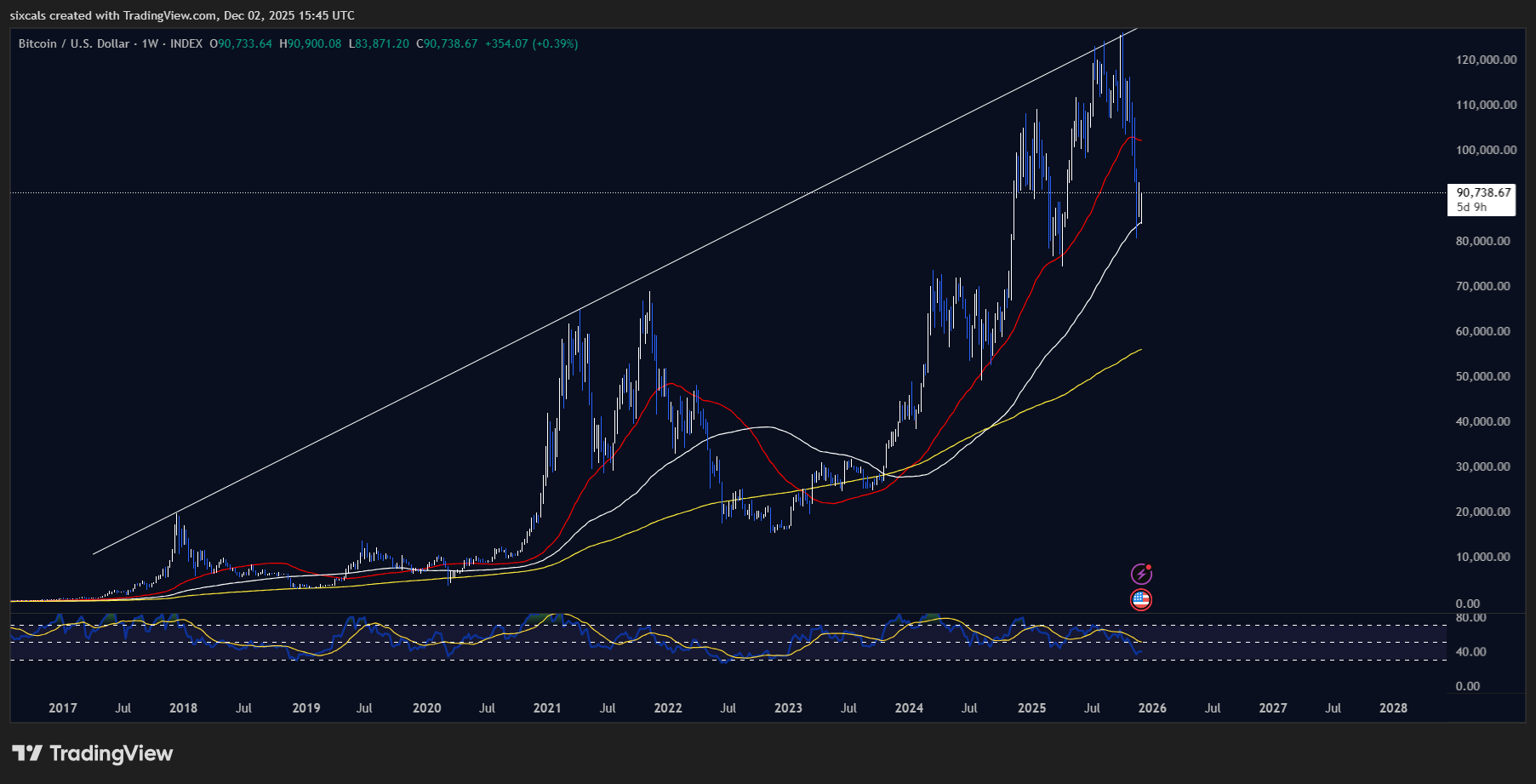 Death Cross: Terjadi death cross (ketika MA jangka pendek melintasi di bawah MA jangka panjang) pada Oktober 2025, yang menunjukkan bearish momentum jangka pendek. Jika Bitcoin gagal untuk kembali di atas 50-minggu MA, ini dapat memicu penurunan lebih lanjut.